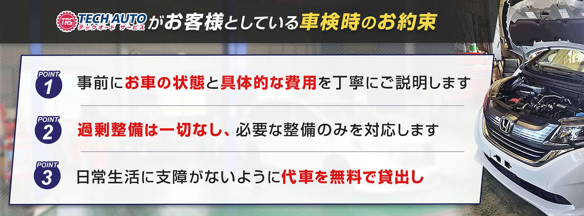テックオートサービスの車検をご利用いただきましたお客様には、6か月後点検を無料で受けていただけます。ご予約はお気軽にどうぞ。