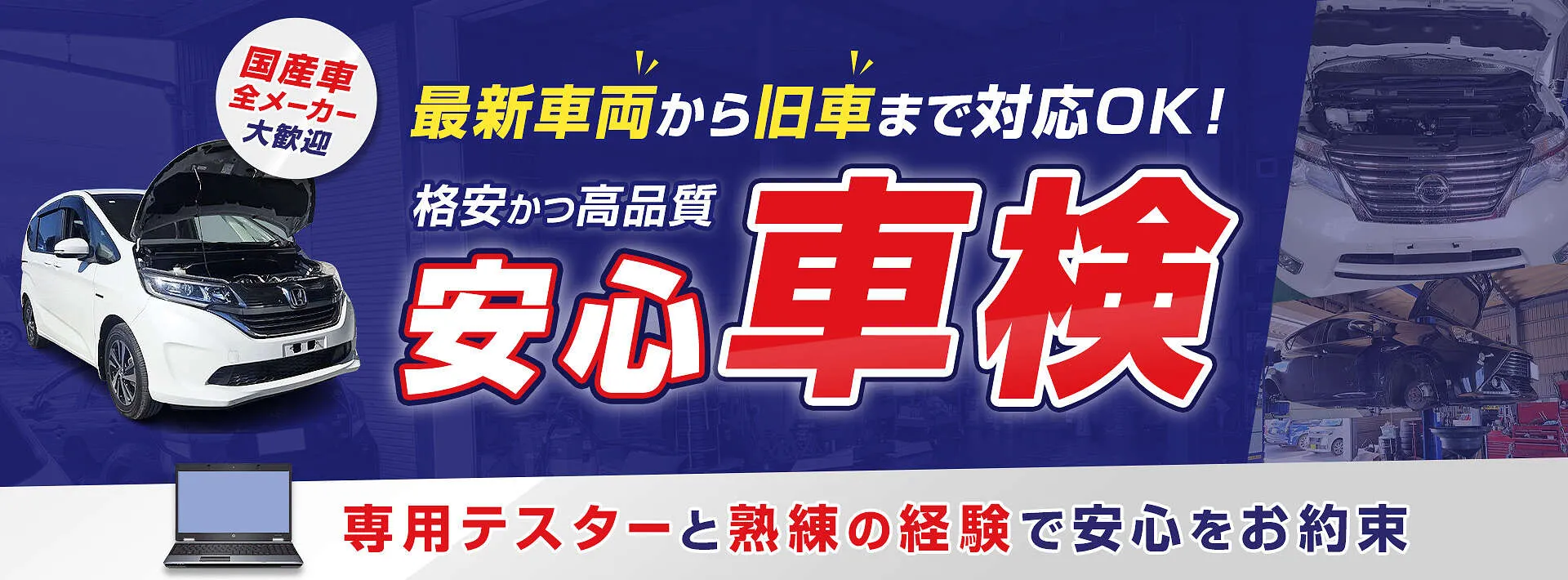 汎用テスターを3台完備しており、国産車オールメーカー全車種の車検に対応が可能。